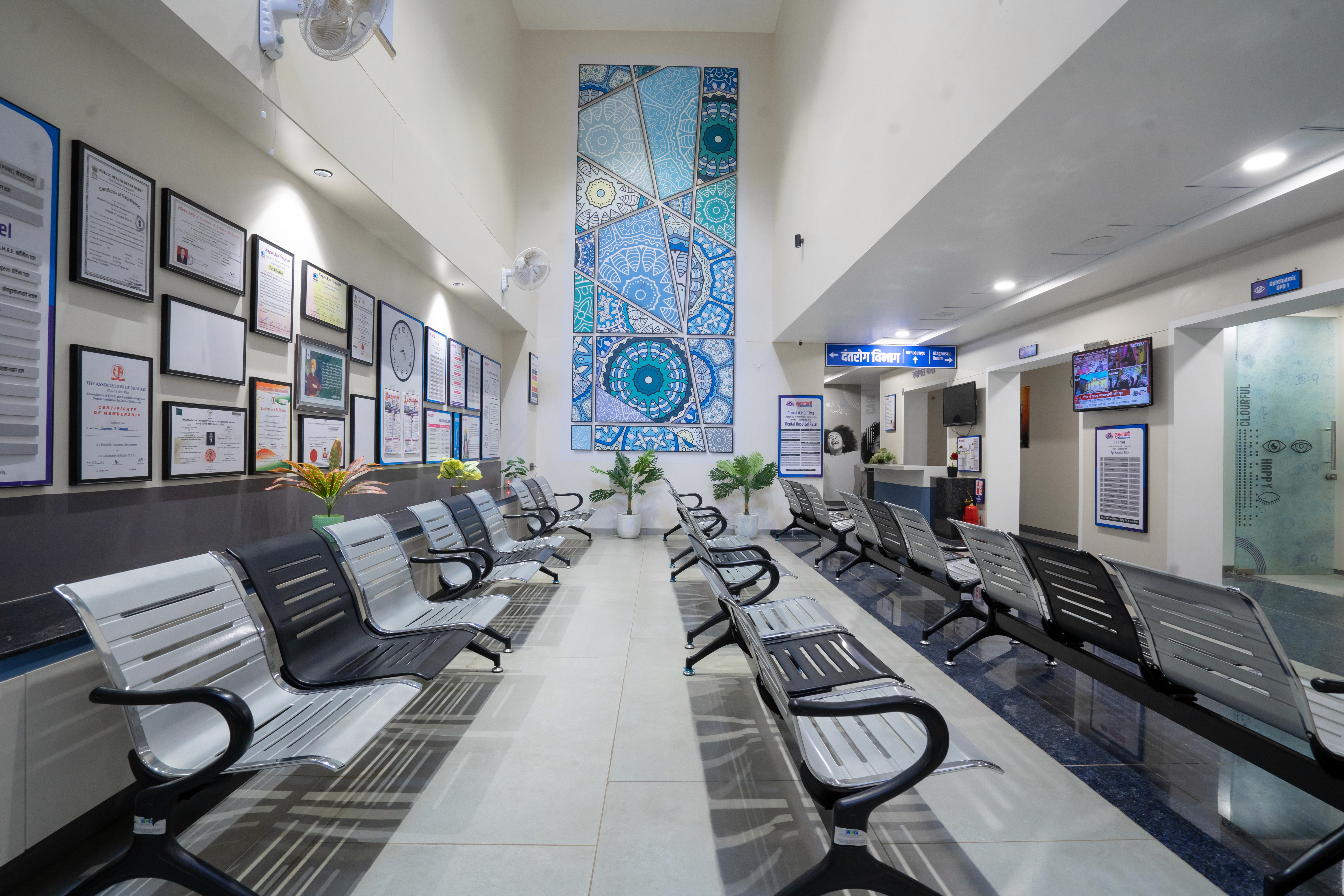 A healthcare space reimagined with calming blue murals, clear navigation, and cohesive branding to enhance patient comfort and experience.